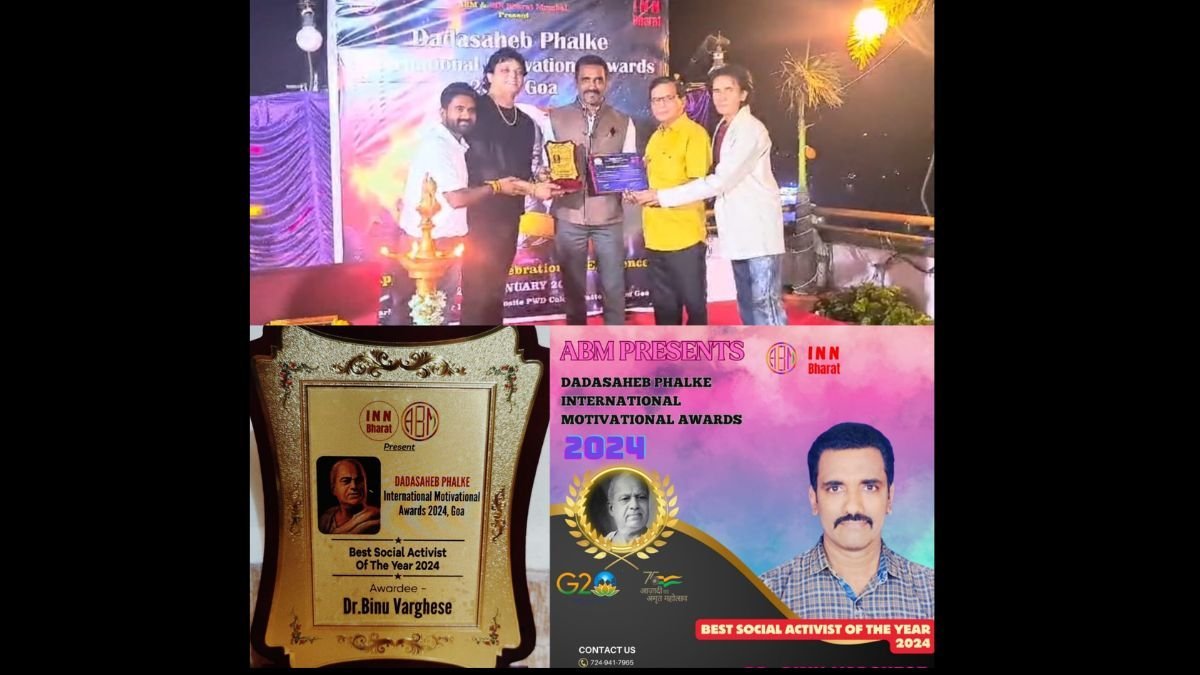New Delhi (India), January 31: Renowned social activist Dr. Binu Varghese was honored with the Dadasaheb Phalke International Motivational Awards 2024 Trophy and an Appreciation Certificate for outstanding social work. The event took place at Park Prime Hotel in Panjim, Goa, and was successful with esteemed dignitaries such as Shri Govind Gaude (Hon Minister for Art & Culture, Youth & Sports, Goa), Shri Anant Joshi (Chief Naval Officer – Kargil War Veteran), Rakesh Sawant (Bollywood Director), Karan Samarth (Actor-writer-filmmaker), Prof Prajal Sakhardande, Adv Shivaji Desai, and many other social workers from across Maharashtra.